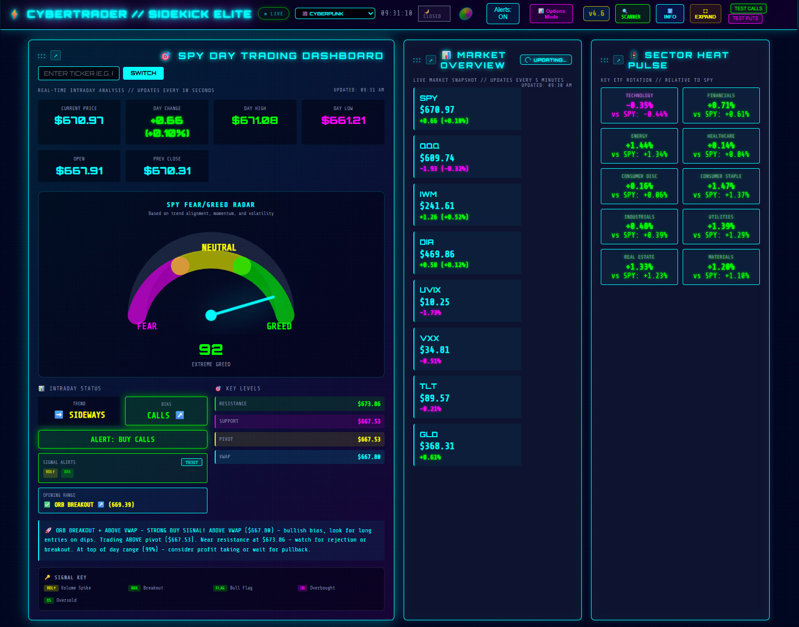 CYBERTRADER // SIDEKICK consolidates multi-stage technical confluence — including trend, range, and intraday structure — into a real-time dashboard.